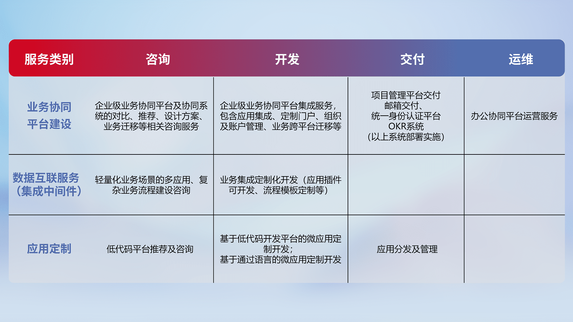 针对钉钉、、、、企微、、、、IDaas等平台级产品提供产品的规划、、、方案、、交付、、、定制化开发等服务,,,,实现如统一协同办公、、、智能客户服务、、、混合会议管理、、、智能数据查询、、、等业务场景,,,,实现数字化转型。。